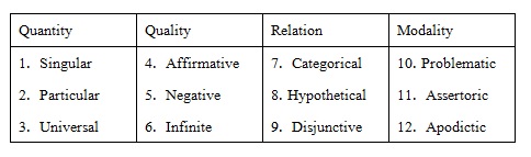 2. ความรู้ระดับวิชาการ(Scientific Knowledge) เป็นความรู้สากล ผ่าน 12 แบบบริสุทธิ์แห่งความเข้าใจ (Pure Forms of Understanding) ซึ่งมี 4 ชั้น ๆ ละ 3 ช่อง เพื่อได้ความรู้ระดับนี้ นูเมนา ต้องได้ผ่านแบบแห่งความรู้สึกมาแล้ว จึงมาผ่านทั้ง 4 ชั้น ๆ ละ 1 ช่อง ความรู้ต่างประเภทกัน จะผ่านช่องต่าง ๆ กันไป มีกลไกเรียกว่า สคีมาตา (Schemata) คอยป้อนให้ถูกช่อง ดังตารางต่อไปนี้