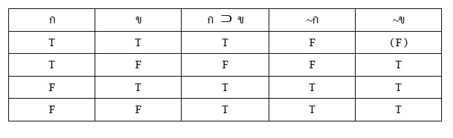 อธิบายชุดของการอ้างเหตุผล ในชุดการอ้างเหตุผลดังกล่าว มีข้อความเชิงเดี่ยว 2 ข้อความ ซึ่งแต่ละข้อความก็จะมีความเป็นไปได้ของตน โดยเฉพาะที่แตกต่างกันออกไป เมื่อนำทั้ง 2 กรณีมารวมเข้าด้วยกันแล้วก็จะเกิดชุดของการอ้างเหตุผลที่มีความเป็นไปได้มากที่สุดเท่าที่จะมากได้ทั้งหมด 4 กรณี จากตารางช่องที่ 5 จะสังเกตเห็นได้ว่าเป็นข้อสรุปนั้นมีกรณีที่ 1 (บรรทัดแรก) ที่ข้ออ้างจริงด้วยกันทั้งหมด แต่ข้อสรุปเป็นเท็จ ทำให้ชุดของการอ้างเหตุผลนั้นมีกรณีเป็นเท็จ ( F ) ถึงแม้ในชุดของการอ้างเหตุผลที่เหลือจะเป็นจริงทุกกรณีก็ตาม ก็ถือว่าชุดของการอ้างเหตุผลนั้นไม่แน่นอนใช้ไม่ได้ เพราะถ้าขืนสรุปต่อไปก็จะต้องถือว่าเป็นเหตุผลวิบัติ
