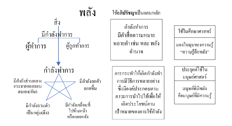 พลังทำการนั้นจะมีกำลังทำการมากหรือน้อยนั้นมีองค์ประกอบแตกต่างกันไปตามเหตุและปัจจัยที่ส่งเสริมให้เกิดกำลังทำการตามเป้าหมายที่ต้องการ พลังทำการเป็นสาระหนึ่งของสิ่งต่าง ๆ ถือว่าเป็นภาวะแฝง (latency) ที่มีอยู่ในสรรพสิ่ง ภาวการณ์ทำการของสิ่งบางสิ่งมีกลไกทำการในตนเองของสิ่งที่มีชีวิต นักปรัชญาบางท่านเรียกว่า “พลังชีวิต” บางท่านเรียกว่า “พลังดิ้นรน” และเกิดมีขึ้นในสิ่งที่ไม่มีชีวิต จึงเรียกว่า “พลัง” ภาวะการทำการของสิ่งจึงมีชื่อเรียกแตกต่างกันออกไป แต่เมื่อใดที่กล่าวถึงพลังจึงบ่งบอกให้ทราบว่า สิ่งมีภาวการณ์ทำการที่พร้อมจะทำการให้เกิดผลตามเป้าหมายที่ต้องการของผู้ใช้ทำการ ดังภาพ 1