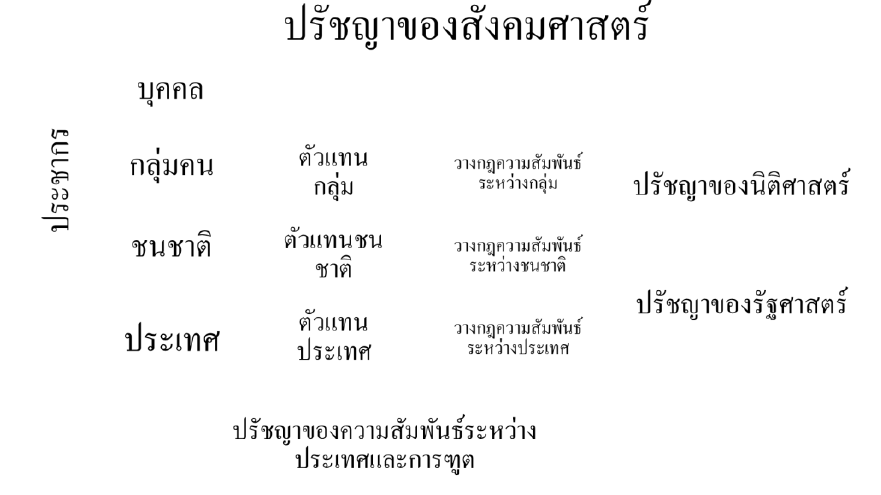 ในทรรศนะทางปรัชญาของสังคมศาสตร์ ได้วางระบบความเป็นชาติไว้ในลักษณะที่เป็นการรวมตัวของกลุ่มคน ชนชาติ ที่ยอมรับร่วมกันเพื่อวางขอบเขตตามที่แต่ละกลุ่มได้ตั้งถิ่นฐานอยู่อาศัย ดังภาพ 3 แสดงให้เห็นว่า ความเป็นชาติอยู่ในกรอบความคิดทางปรัชญาของสังคมศาสตร์ โดยมีความคิดทางปรัชญาของนิติศาสตร์และรัฐศาสตร์ทำหน้าที่เป็นผู้จัดการให้เกิดระบบความสัมพันธ์ที่ดีต่อกัน ทั้งในระดับกลุ่มคน ชนชาติ และนานาชาติ ซึ่งถ้ามีทรรศนะตามแนวคิดนี้จะมีปรัชญาของความสัมพันธ์ระหว่างประเทศและการทูตเข้ามารองรับการอยู่ร่วมกันในระดับสังคมโลก
