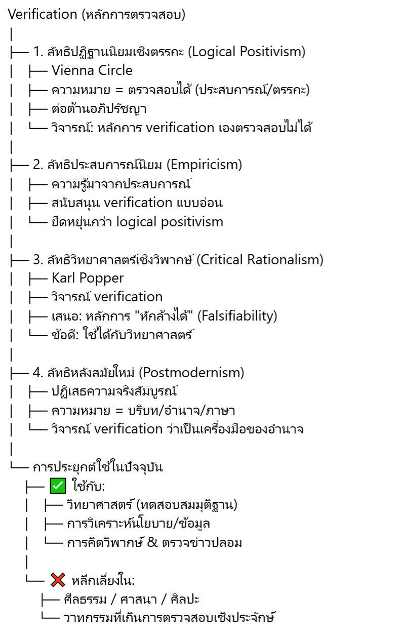 | ลัทธิ | ท่าทีต่อแนวคิด verification | จุดเน้น |