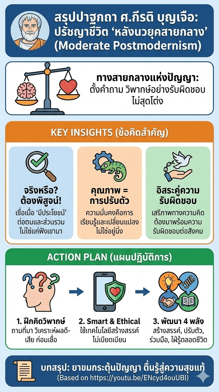 กระบวนทรรศน์หลังนวยุคสายกลางเป็นความพยายามเชิงปรัชญาที่สำคัญในการหาจุดสมดุลระหว่างเหตุผลกับการวิพากษ์ ระหว่างความจริงกับความไม่แน่นอน และระหว่างเสรีภาพกับจริยธรรม เมื่อเชื่อมโยงกับแนวคิดเรื่องความสุขแท้ พลังการพัฒนาชีวิต และจริยธรรมดิจิทัล จะเห็นได้ว่าแนวคิดนี้มิได้เป็นเพียงกรอบทฤษฎี หากแต่เป็นแนวทางการดำรงชีวิตอย่างมีสติ ปัญญา และความรับผิดชอบในโลกสมัยใหม่
