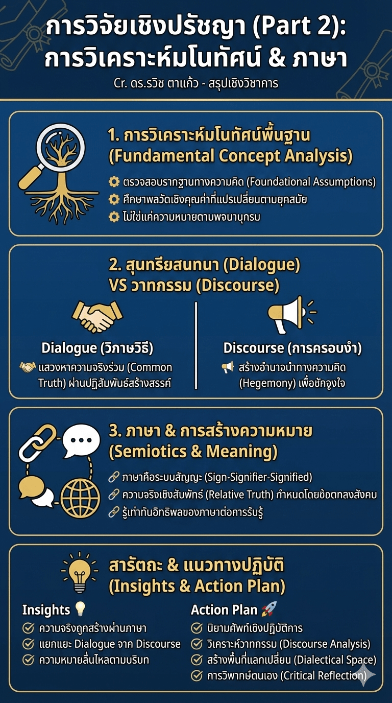 หากการวิจัยเชิงปรัชญาในส่วนแรกมุ่งเน้นการทำความเข้าใจ “กระบวนทรรศน์” (paradigm) ในฐานะรากฐานของการวิจัย ส่วนที่สองนี้ขยายขอบเขตการวิเคราะห์ไปสู่ระดับที่ลึกยิ่งขึ้น นั่นคือ ระดับของ มโนทัศน์ (concepts) และ ภาษา (language) ซึ่งเป็นโครงสร้างพื้นฐานที่กำหนดขอบฟ้าของความคิด ความรู้ และความจริงในสังคมมนุษย์