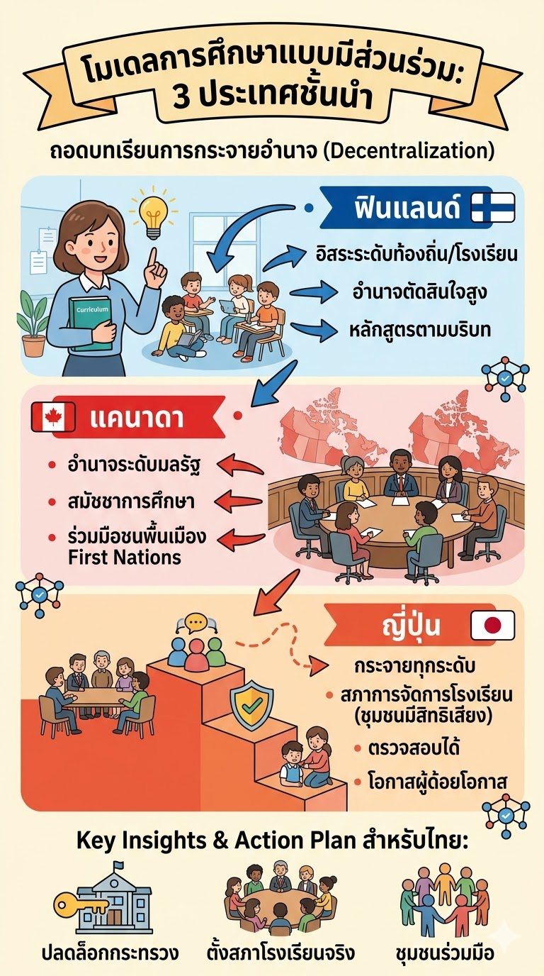 จากผลการศึกษาของ Suwanbundit (2021) ในตัวแบบประเทศที่มีการจัดการศึกษาแบบมีส่วนร่วม พบว่า ประเทศเหล่านี้มีโครงสร้างการบริหาร 3 ระดับ ได้แก่ โครงสร้างหลัก โครงสร้างรอง และโครงสร้างสนับสนุน ซึ่งล้วนตั้งอยู่บนหลักการกระจายอำนาจ แม้ระดับพื้นที่ที่ใช้จะมีความแตกต่างกัน ได้แก่ 1) กรณีศึกษาประเทศฟินแลนด์ ระบบการศึกษาของฟินแลนด์ได้รับการยอมรับอย่างกว้างขวางว่าเป็นหนึ่งในระบบที่มีคุณภาพสูงที่สุดในโลก (Sahlberg, 2015) ลักษณะสำคัญของระบบนี้คือ การกระจายอำนาจสู่ระดับท้องถิ่น โรงเรียนมีอิสระสูงในการออกแบบหลักสูตรและวิธีการจัดการเรียนรู้ ขณะที่รัฐบาลกลางกำหนดเพียงกรอบเป้าหมายระดับชาติ การจัดการศึกษาของฟินแลนด์จึงมีลักษณะเป็นเครือข่ายของชุมชนการเรียนรู้ที่เชื่อมโยงกัน มากกว่าระบบลำดับชั้นแบบรวมศูนย์ 2) กรณีศึกษาประเทศแคนาดา แคนาดามีโครงสร้างการปกครองแบบสหพันธรัฐ ทำให้การจัดการศึกษาอยู่ภายใต้อำนาจของแต่ละมลรัฐ (Council of Ministers of Education Canada, 2022) แต่ละรัฐมีนโยบายและหลักสูตรของตนเอง อย่างไรก็ตาม มีการประสานความร่วมมือระดับชาติผ่านองค์กรกลาง เช่น Council of Ministers of Education ระบบนี้สะท้อนแนวคิดการกระจายอำนาจที่ยืดหยุ่น โดยให้ความสำคัญกับความหลากหลายทางวัฒนธรรมและสังคม และ 3) กรณีศึกษาประเทศญี่ปุ่น ญี่ปุ่นมีระบบการศึกษาที่ผสมผสานระหว่างการกำกับจากส่วนกลางและการกระจายอำนาจสู่ระดับท้องถิ่น (OECD, 2018) สภาการศึกษากลางกำหนดทิศทางนโยบาย ขณะที่จังหวัดและเขตพื้นที่การศึกษามีบทบาทสำคัญในการบริหารจัดการโรงเรียน กลไกสำคัญคือ สภาการจัดการโรงเรียน (school administration council) ซึ่งเปิดโอกาสให้ชุมชนมีส่วนร่วมในการกำหนดทิศทางการศึกษา