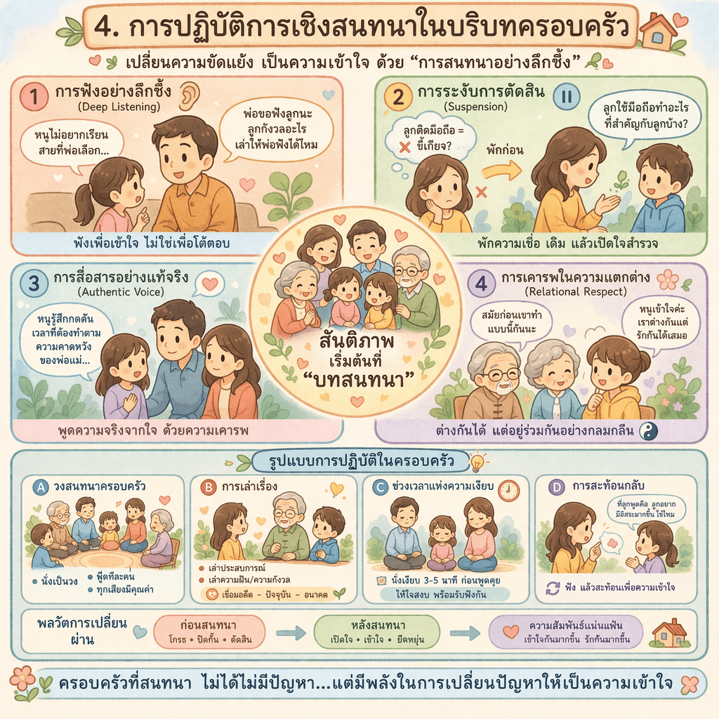 การสนทนาในบริบทครอบครัวมิใช่เพียงเครื่องมือสื่อสาร หากเป็นปฏิบัติการเชิงภววิทยา (ontological practice) ที่เปลี่ยนแปลงวิธีการเป็นอยู่ร่วมกันของสมาชิกในครอบครัว ในกรอบของ Bohm (1996) การสนทนาเปิดพื้นที่ให้ความคิดถูกมองเห็น แทนที่จะถูกยึดถือ ขณะที่ Buber (1970) มองว่าการสนทนาที่แท้คือการเปลี่ยนความสัมพันธ์จาก I–It (ฉัน-มัน = กดขี่) ไปสู่ I–Thou (ฉัน-เธอ เสมอภาคกัน) เมื่อผสานกับแนวคิดจีน li (禮; รูปแบบ/จังหวะของความสัมพันธ์) he (和; ความกลมกลืน) wu wei (無為; การไม่ฝืน) การสนทนาจึงกลายเป็นศิลปะแห่งการอยู่ร่วมมากกว่าการแลกเปลี่ยนข้อมูล